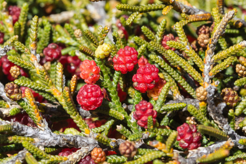 Ein af hinum furðulegu tegundum innan gagnviðarættarinnar heitir Microcachrys tetragona og vex í fjöllum Tasmaníu ofan við 1.000 metra hæð yfir sjávarmáli. Þar kalla heimamenn tegundina jarðlæga jarðarberjafuru eða creeping strawberry pine ef þeir kunna ensku. Þetta er samt ekki fura og þessi furðulegu aldin eru ekki jarðarber. Strangt tiltekið eru þetta kynhirslur sem við í daglegu tali köllum köngla. Þessi ættkvísl hefur lifað á jörðinni í 66 milljónir ára og óx forðum víða um suðurhvel jarðar. Leifar hennar hafa meðal annars fundist á Suðurskautslandinu. Mynd og upplýsingar eru héðan en myndina tók Tindo2.