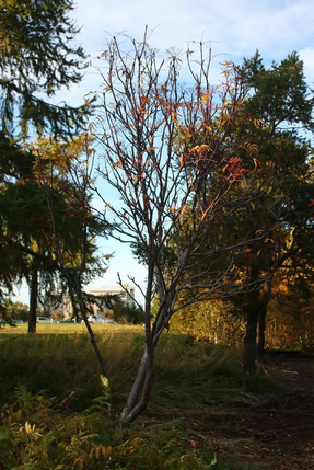 Sami knappareynirinn í Lystigarðinum á mismunandi tímum ársins. Hann þekkist á því að stofninn er nokkuð skakkur. Á öllum myndunum er tréð með töluvert af berjum. Sumt af knappareyni á Íslandi nýtir sumarið ekkert allt of vel til vaxtar. Lokamyndin var tekin 25. september 2017. Þá eru flest tré enn nær allaufguð þótt mörg séu komin í haustliti en þetta tré var nær alveg lauflaust eins og sjá má. Myndir: Sig.A.