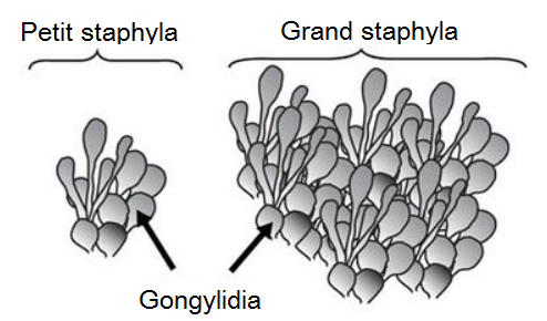 Tvær myndir af vef Wikipediu sem sýna gongylidia (merkt g á ljósmynd) sem vex á fyrirbæri sem kallast staphylae (merkt s á ljósmynd). Myndirnar eiga Henrik H. De Fine Licht, Jacobus J. Boomsma og Anders Tunlid.